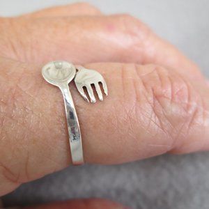 Beautiful solid sterling silver small spoon and fork ring. Perfect for all you cooks, chefs, catering business, or just if you like to eat!! Face height = 12mm. This is a lighter weight ring, extremely comfortable on your finger (as it kind of wraps around it), and is stamped 925. You're going to love it! Slightly adjustable.
