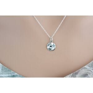 This is a Sterling Silver Soccer Ball Charm Necklace. The charm comes on an 18 inch chain.