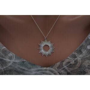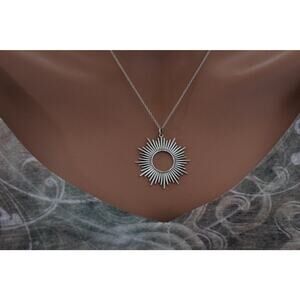 This is Sterling Silver Spikey Sun Charm Necklace. Both the charm and the necklace are Sterling Silver. This charm comes on an 18 inch chain