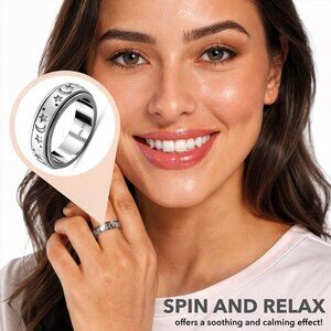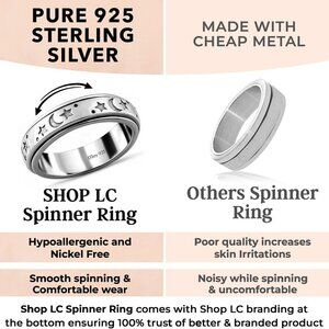 Features: Crafted from genuine 925 sterling silver with platinum plating, this smooth, comfortable spinner ring features a moon and star design that’s perfect for helping reduce stress and anxiety. The versatile band fits elegantly on any finger—whether it’s your middle, index, or even thumb.