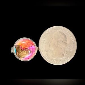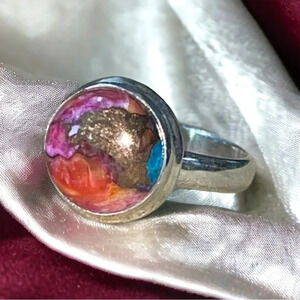 The vibrant dome cut pink spiny oyster Mojave turquoise stone that adorns this ring is simply enchanting and is bezel set in sterling silver. This type of stone is created using spiny oyster shells and natural turquoise, compressed and combined together with veins of copper, vivid pink dyes, and resin. The last image shows the stone under UV light.