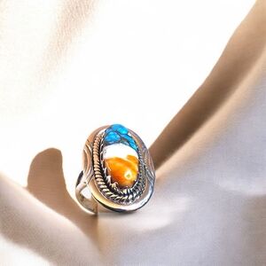 This bold handcrafted ring features a long oval cabochon of composite Spiny Oyster Shell + Turquoise, expertly inlaid to highlight layers of electric blue, sunlit orange, and creamy white matrix. Set in a detailed .925 sterling silver bezel with braided rope and stampwork edges, it’s giving big energy with major artisan vibes.