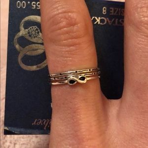 Size 8, three stackable rings. One with a small black infinity, and two thin simple ones with black detailing.