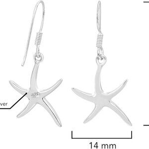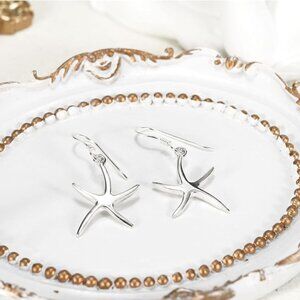 Features: Delicate sterling silver dangle earrings shaped like adorable starfish, with a shiny, polished finish. Lightweight, cute, and perfect for summer outings or ocean-themed outfits. French wire hooks make for easy wear.