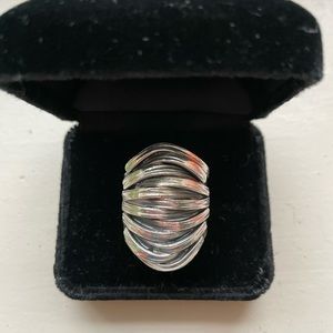 This is a very heavy sterling silver ring. It’s gorgeous on but it’s a real statement piece. I think it’s a 7.5 but I haven’t put it on a mandrel. I’m pretty good at gauging though I work in fine jewelry for a living. It’s been recently cleaned and ready to go.