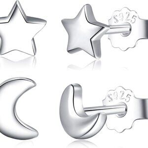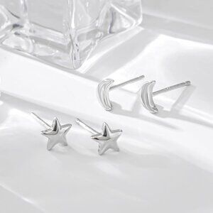 Sterling Silver Stud Earrings Moon Star Dainty Minimalist Gift for Women