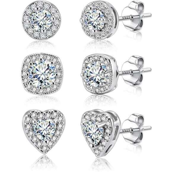 ALEXCRAFT Sterling Silver Stud Earrings for Women Girls Cubic Zirconia Halo Round Heart Square Diamond Large Silver Stud Set department : unisex-adult