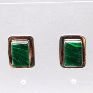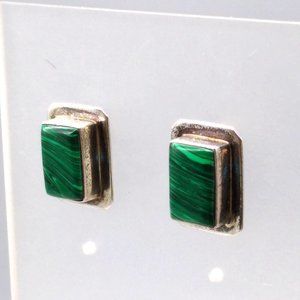 Sterling Silver Stud Earrings with Malachite Stone, Elegant Rectangles