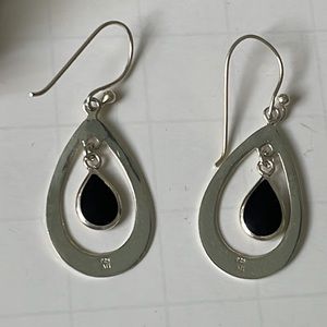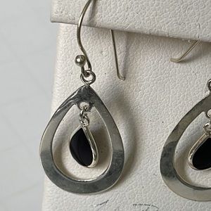 Lovely pair of sterling silver 925 earrings with a pear shape black onyx inside the cut out tear drop shape. It weights approximately 1.69 grams. Light wear.