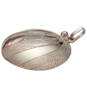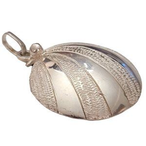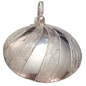 This beautiful round Domed Modernist Orb Pendant is crafted in sterling silver to stand the test of time. The textured pattern alternating with the polished surface brings interest and gives this piece a more substantial look and feel. This pendant measures approximately 1.6 inches in diameter, and 1.9 inches in length including the bale, and weighs 9.88 grams. The bale will enable you to attach this charm to your bracelet, necklace, keychain, purse, or anywhere you desire. Just add this charm to your favorite chain necklace and you can match it with other jewelry in your collection for an upscale statement look. Please note that there are some scratches on this piece.