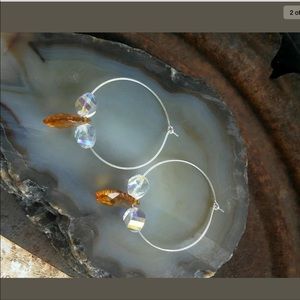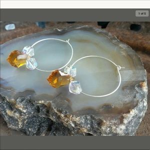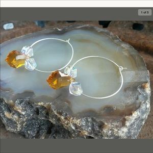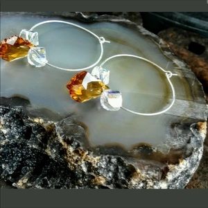 Swarvoski Austria Topaz Drop Beads and Two Clear Crystal Beads on Sterling Silver Wire Hoops