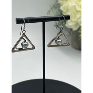 These sophisticated sterling silver earrings showcase a modern geometric design with open triangular frames that gracefully suspend lustrous 6-7mm cultured pearls. The triangular outlines create an eye-catching contemporary silhouette while the while the pearls add classic elegance. Each earring features French hook ear wires for comfortable wear. The sterling silver construction (marked "925") ensures quality and durability at 8.1 grams total weight.