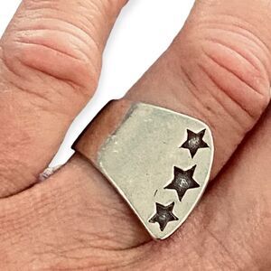 Sterling silver accented with three black matte stars cosmos, celestial, astrology vibe on tapered wide band ring!