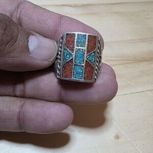 Sterling Silver Turquoise And Coral Inlay Brutalist Statement Ring Solid Back heavy size 11 weighs 17 grams native american southwestern style mens ring shows signs if wear sold as is see pictures for reference