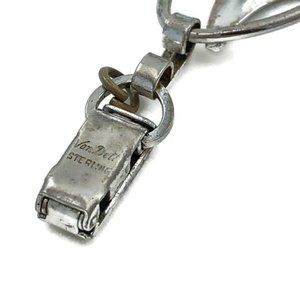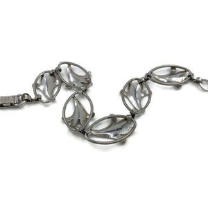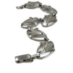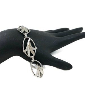 1940's vintage sterling silver Van Dell bracelet. This modernist design bracelet has six linked ovals with a brushed silver leaf that sits on top of each.
