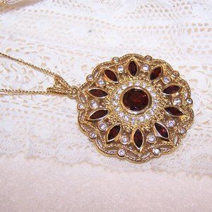 Dating to the 1980s/1990s or so, here's a Sterling Silver (hallmarked as pictured) pendant. In a round shape, the piece is covered in a heavy layer of yellow gold and is embellished with red and clear cubic zirconia CZ crystals. Makers marks are JTC China. The round alone measures 1-5/16" high/wide' the bale adds another 5/16" of height. Weight is 10 grams. Condition is very fine with no problems I can spot. The gold overlay makes the piece look like it is a bright piece of costume - with the right chain or cord, this can be the focal point to any outfit.
