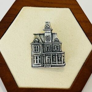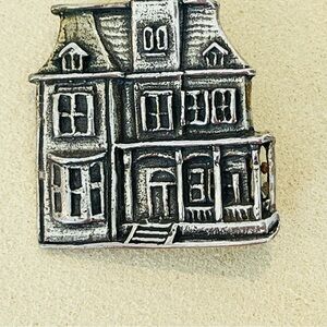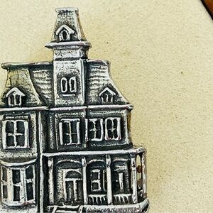 Elegant silver brooch featuring a detailed house design. The Mansard Mansion is a historic Victorian Mansion located in Galveston Texas.