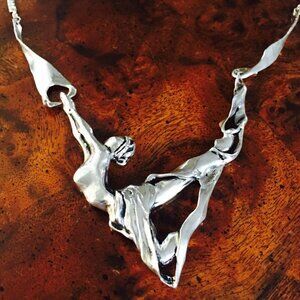 This Sterling Silver Vintage Modernist Acrobat Necklace features an elegant circus trapeze design, handcrafted by artisans. A perfect statement piece for any occasion, blending vintage charm with modernist flair.