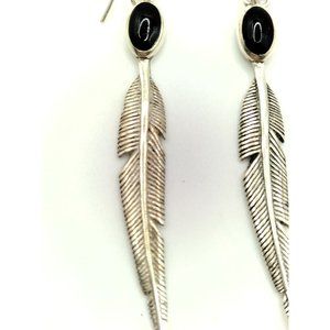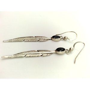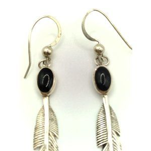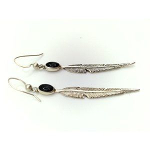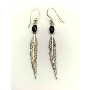 Sterling Silver Vintage SC Stamped Navajo Onyx & Feather Earrings