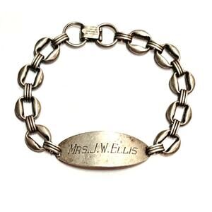 This is an authentic World War II era sweetheart bracelet fashioned from sterling silver, likely dating to the 1940s. Sweetheart jewelry was traditionally worn by women to honor a serving loved one. This example is engraved on the name tag with "CAPT. J.W. ELLIS U.S.N." (Captain J.W. Ellis, U.S. Navy), making it a highly personalized and historical military collectible. The bracelet features a classic chain design of interlocking links connected by the central identification bar. Its sterling composition and solid construction are typical of the patriotic jewelry produced during that time.