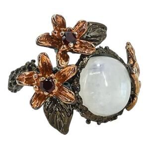 This sterling vermeil “garden” ring features a central white moonstone cabochon (likely rainbow moonstone based on the soft glow), accented with copper-tone flowers & butterfly, garnet-colored stones and the organic, oxidized branch-style band.