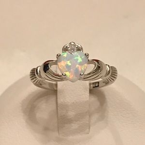 Sterling Silver White Lab Opal Claddagh Ring, Irish Rings, Silver Heart Ring