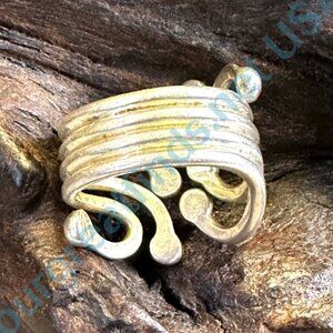 Previously owned sterling silver wire art ring with orb tips. It is adjustable, but right now it is a size 8. It is 7/8” wide. Weight: 10 grams. Stamped sterling. Import.