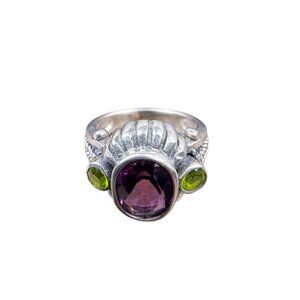 Sterling Silver Womens Amethyst Green Peridot Ring Intricate Design Size 7