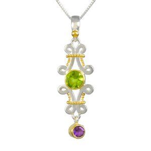 Balinese culture is steeped on repeated geometric patterns, decorating temples and buildings, and an integral part of art, like batiks and jewelry. This simple yet elegant Sterling Silver pendant from Michou is built on a repeating and reversed pattern, adorned in twisted silver wire and granulation with 22K gold vermeil highlights. A peridot and African Amethyst complete this pendant.