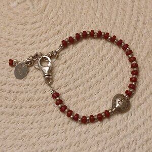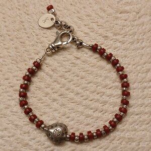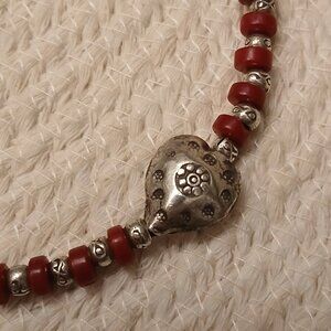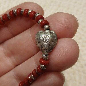 This pretty bracelet is comprised of disks of Cinnabar gemstones with stamped Sterling Silver beads and features a 1/2 inch puffed Sterling Silver heart shaped stamped with a floral design.