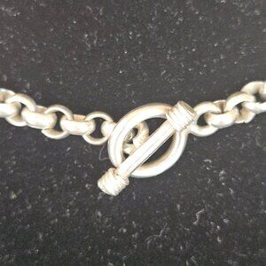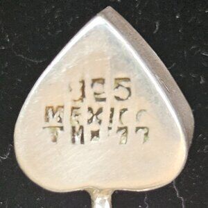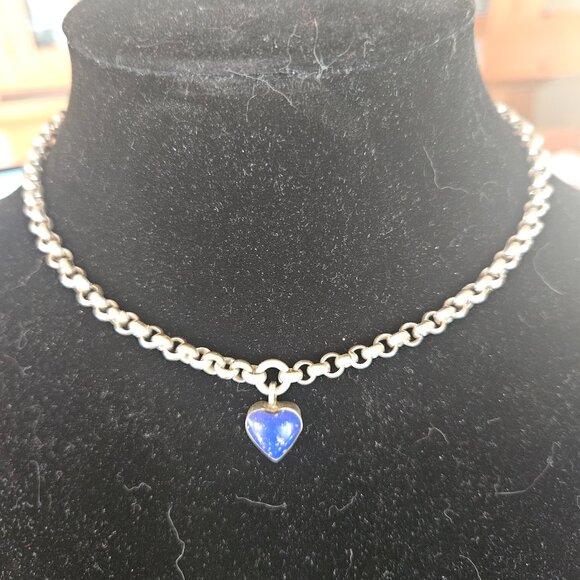 The necklace is from Taxco, Mexico. It is stamped 925. The chain is solid silver. It has some weight to it. Unknown amount of silver content. The length is 7.5"s, the width is .4cm. The Heart is lapiz lazuli set in sterling silver. It is very good condition. Purchased in Taxco Mexico.