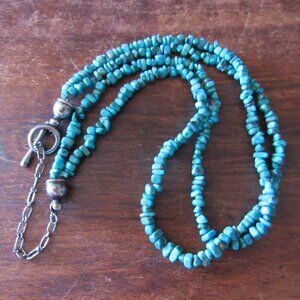 Made of Turquoise and Sterling Silver, this pretty necklace measures 20". It is stamped but the whole thing needs re stringing.