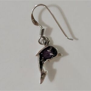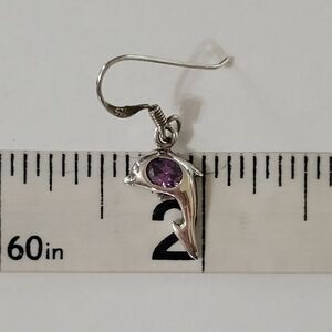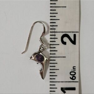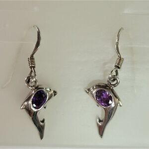 These sterling silver dolphin earrings are perfect for any fan of aquatics and ocean life. Each adorable little dolphin is carefully detailed and hold a beautiful amethyst stone. A must-have for anyone who loves swimming with the dolphins. Each earring hangs from a Sterling Silver hook.