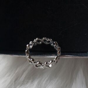 This elegant Sterling Silver band ring features a symbolic design, where delicate hearts are intricately linked together to form a beautiful and meaningful pattern.