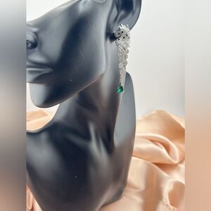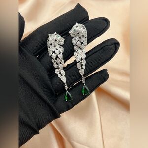 Turn heads with these luxuriour earrings, featuring a bold panther motif and sparkling cubic zirconia stones. The striking green teardrop accents add an extra layer of elegance, making these earrings perfect for special occasions or glamorous evenings.