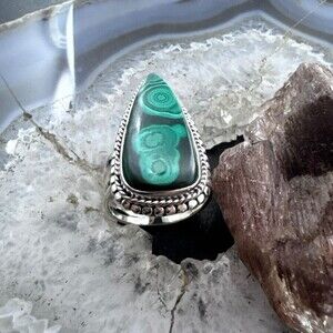 Sterling Southwestern Style Elongated Teardrop Malachite Decorated Ring Size 9