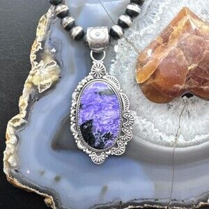 Eye-dazzling and Beautiful Sterling Silver Southwestern Style Large Oval Charoite Decorated Pendant For Women.