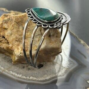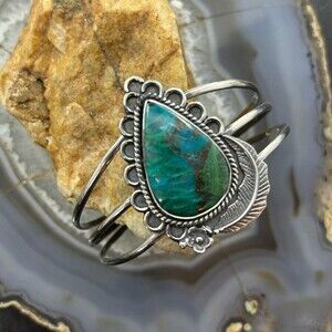 Sterling Silver Southwestern Style Large Teardrop Shattuckite Flexible and Adjustable, Decorated Split Shank Bracelet For Women.
