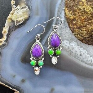 Sterling Silver Southwestern Style Teardrop Purple Mohave Turquoise, Variscite, Wild Horse, Decorated Cluster Dangle Earrings For Women.