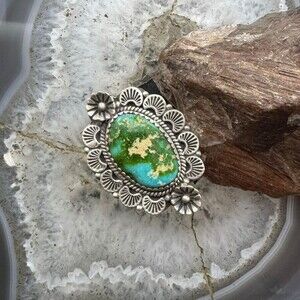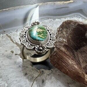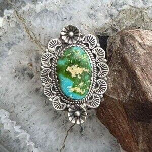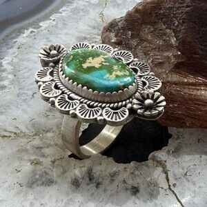 Eye Calling Sterling Silver Southwestern Style High Grade Oval Sonora Gold Turquoise Flower Decorated Adjustable Ring For Women.