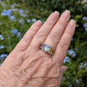 Beautiful cluster cocktail ring with multicolor gemstones in prong-set sterling weighs 6 grams.
