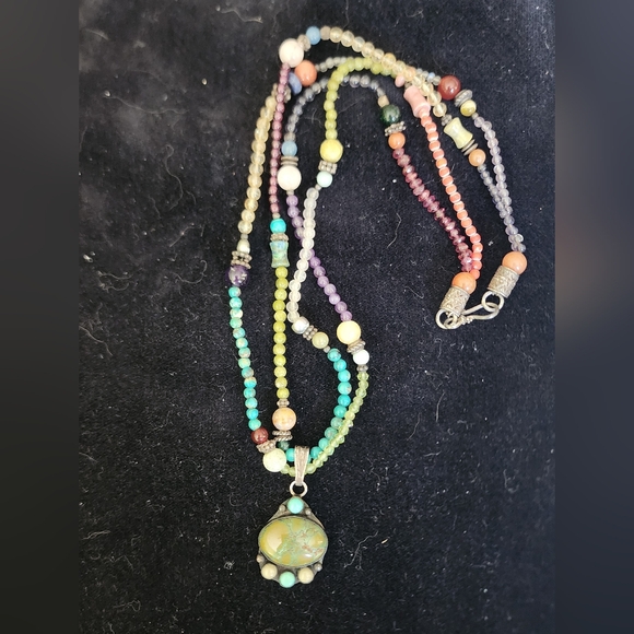 EUC Sterling and gemstone necklace 16". Pendant approximately 1". I believe the pendant is Tibetan turquoise, turquoise, quartz, and sterling. The necklace includes garnet, amethyst, Turquoise, carnelian, quartz, and jade among others with sterling accents. Closure is hook and eye with detailed sterling clasps. Very unique and beautiful. Unfortunately I wore it so much the hallmark is no longer legible, all that remains is "Inc. and 925".