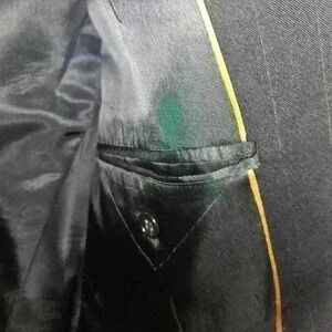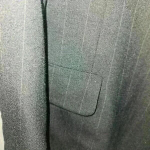 This luxe dark navy blazer with elegant pinstripes, features single breasted closure, two front pockets, handkerchief pocket and two inside pockets. It is fully lined, 100% fine quality wool and in pristine condition.