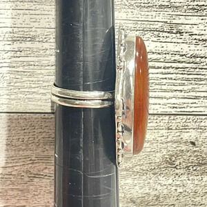 This is a beautiful genuine, coral sterling silver over bronze ring. That is size 8. It is adjustable as one side of the band near the stone does adjust because it is not soldered to the underside of the stone. This is stamped 925 however it has been tested and there is a spot on the back of the band from the scraping from the testing where you can see the bronze underneath the silver. It is a very small area maybe an eighth of an inch long. So I am selling this is a costume jewelry piece even though it does have a genuine stone