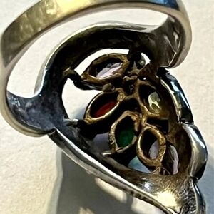 here is a beautiful Sterling silver Marcasite ring with various colored stones