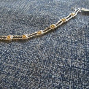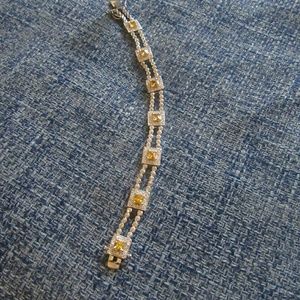 Square yellow cubic zirconia stones surrounded by smaller round white czs. The squares are connected to a double row of bezel set round small stones.