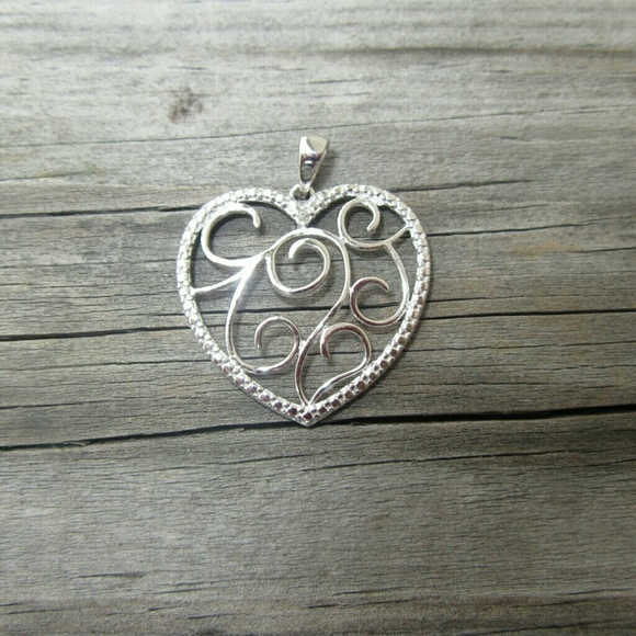 This white swirled design heart pendant is made with cubic zirconia stones. The necklace is sterling silver plated rhodium. The necklace comes with a link Chain.