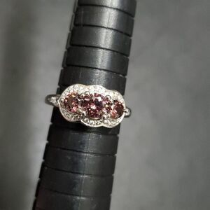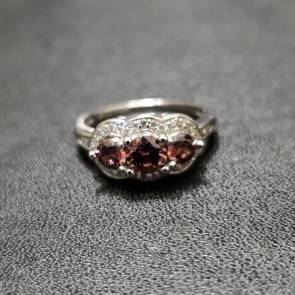 Gorgeous ring is sterling silver with three pretty purplish CZs which are surrounded by clear CZs.