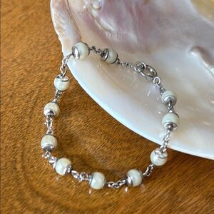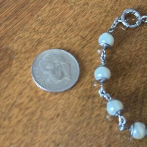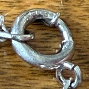 EUC. After looking at the pearls through my loop, I don’t think they are real. Measures 7.5” and is hallmarked “sterling“.