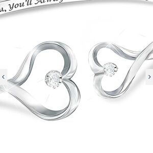• Exquisitely handcrafted and plated in sterling silver in an open bangle design featuring 2 hearts, each set with its own genuine solitaire diamond